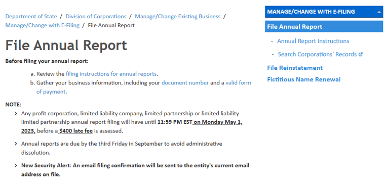 FLORIDA Any profit corporation, limited liability company, limited partnership or limited liability limited partnership annual report filing will have until 11:59 PM EST on Monday May 1, of current year, before a $400 late fee is assessed.